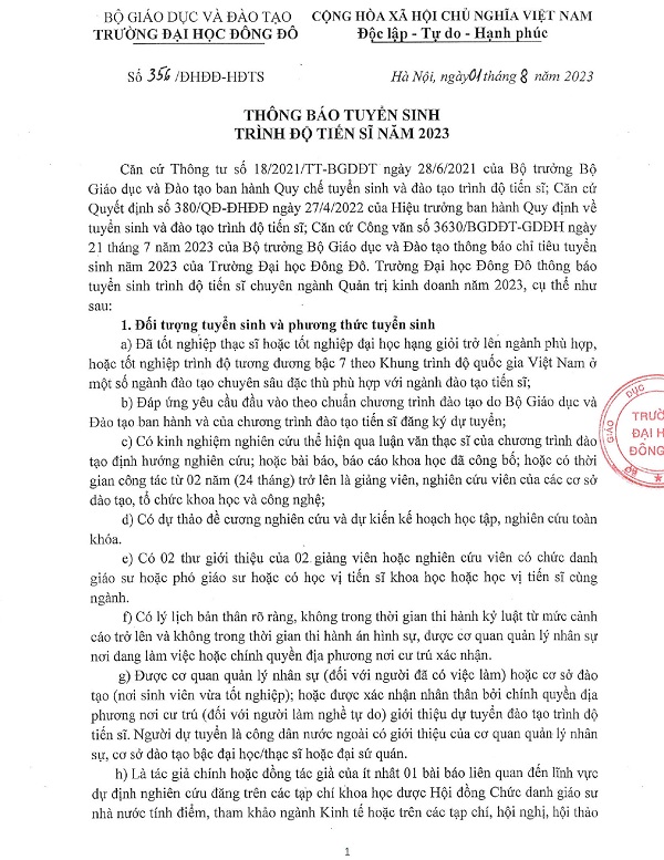Thông báo tuyển sinh trình độ Tiến sĩ năm 2023