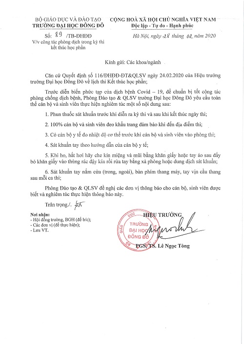 Thông báo về công tác phòng dịch trong kỳ thi kết thúc học phần