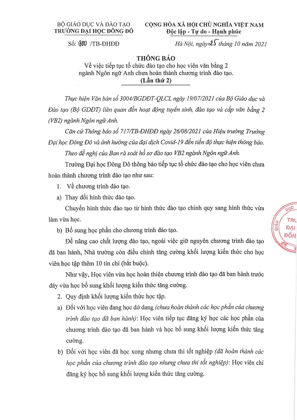 Thông báo về việc tiếp tục tổ chức đào tạo cho học viên văn bằng 2 ngành Ngôn ngữ Anh chưa hoàn thành chương trình đào tạo (lần