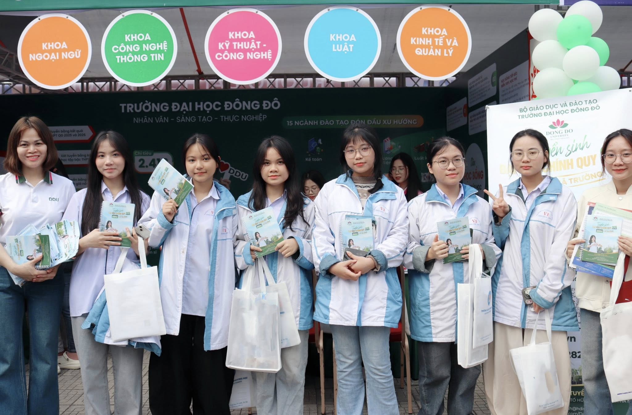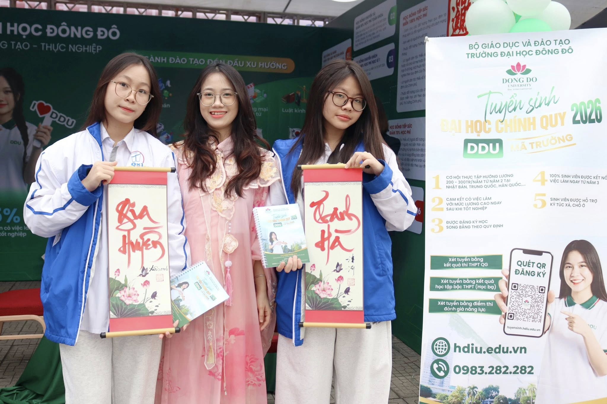 Ngày hội là dịp để học sinh tiếp cận những thông tin thiết thực về tuyển sinh, ngành nghề và xu hướng việc làm trong tương lai, đồng thời giúp các em hiểu rõ hơn về năng lực bản thân, từ đó lựa chọn con đường học tập phù hợp. Trong không khí náo nhiệt của chương trình, gian tư vấn của Trường Đại học Đông Đô đã trở thành điểm đến thu hút đông đảo học sinh và phụ huynh. Đội ngũ cán bộ tuyển sinh và sinh viên Nhà trường đã trực tiếp tư vấn, giải đáp các băn khoăn xoay quanh việc lựa chọn ngành học, phương thức xét tuyển năm 2026, chương trình đào tạo gắn với thực tiễn, cơ hội thực tập, việc làm sau tốt nghiệp, cũng như các chính sách học bổng và hỗ trợ sinh viên. Các em học sinh xếp hàng đăng ký nghe tư vấn tại gian hàng Trường Đại học Đông Đô Cán bộ tư vấn, tặng quà cho các em học sinh Một trong những điểm nhấn đặc biệt tại gian hàng của Trường Đại học Đông Đô là hoạt động “Thầy đồ cho chữ” – nét đẹp văn hóa truyền thống mang đậm giá trị nhân văn. Hình ảnh thầy đồ cẩn thận viết từng nét chữ thư pháp không chỉ thu hút sự quan tâm của các bạn trẻ, mà còn lan tỏa thông điệp về sự trân trọng tri thức. Nhiều học sinh háo hức xin chữ với mong ước có một năm học thuận lợi và sớm chạm tới ước mơ bước vào giảng đường đại học. Hoạt động thầy đồ cho chữ Trải qua hơn 30 năm xây dựng và phát triển, Trường Đại học Đông Đô đã từng bước khẳng định vị thế là cơ sở giáo dục đại học đa ngành, đa lĩnh vực, chú trọng đào tạo gắn với nhu cầu thực tiễn của xã hội. Nhà trường kiên định với sứ mệnh đào tạo nguồn nhân lực chất lượng cao, có đạo đức, bản lĩnh và năng lực hội nhập, đáp ứng yêu cầu phát triển kinh tế – xã hội trong giai đoạn mới. Song song với việc không ngừng nâng cao chất lượng giảng dạy và cơ sở vật chất, Trường Đại học Đông Đô đặc biệt quan tâm đến các chính sách hỗ trợ người học. Trong năm tuyển sinh 2026, Nhà trường tiếp tục triển khai nhiều chương trình học bổng và ưu đãi hấp dẫn, tạo điều kiện để sinh viên yên tâm học tập, rèn luyện và phát triển toàn diện. Trường Đại học Đông Đô hy vọng sẽ được chào đón các bạn học sinh Thanh Hóa trong vai trò tân sinh viên, cùng Nhà trường viết tiếp hành trình tri thức, nuôi dưỡng khát vọng và kiến tạo những giá trị bền vững cho tương lai. Cán bộ tư vấn, tặng quà cho các em học sinh
