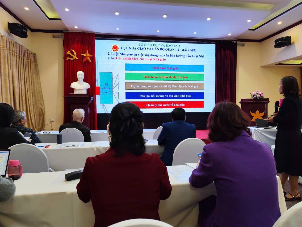 Hội thảo có sự tham dự của đông đảo cán bộ quản lý, giảng viên, nhà giáo đến từ nhiều cơ sở giáo dục trên địa bàn Hà Nội. Các đại biểu đã được nghe báo cáo về việc triển khai Luật Nhà giáo (Luật số 73/2025/QH15) cùng định hướng xây dựng Thông tư quy định Quy tắc ứng xử của nhà giáo trong cơ sở giáo dục.