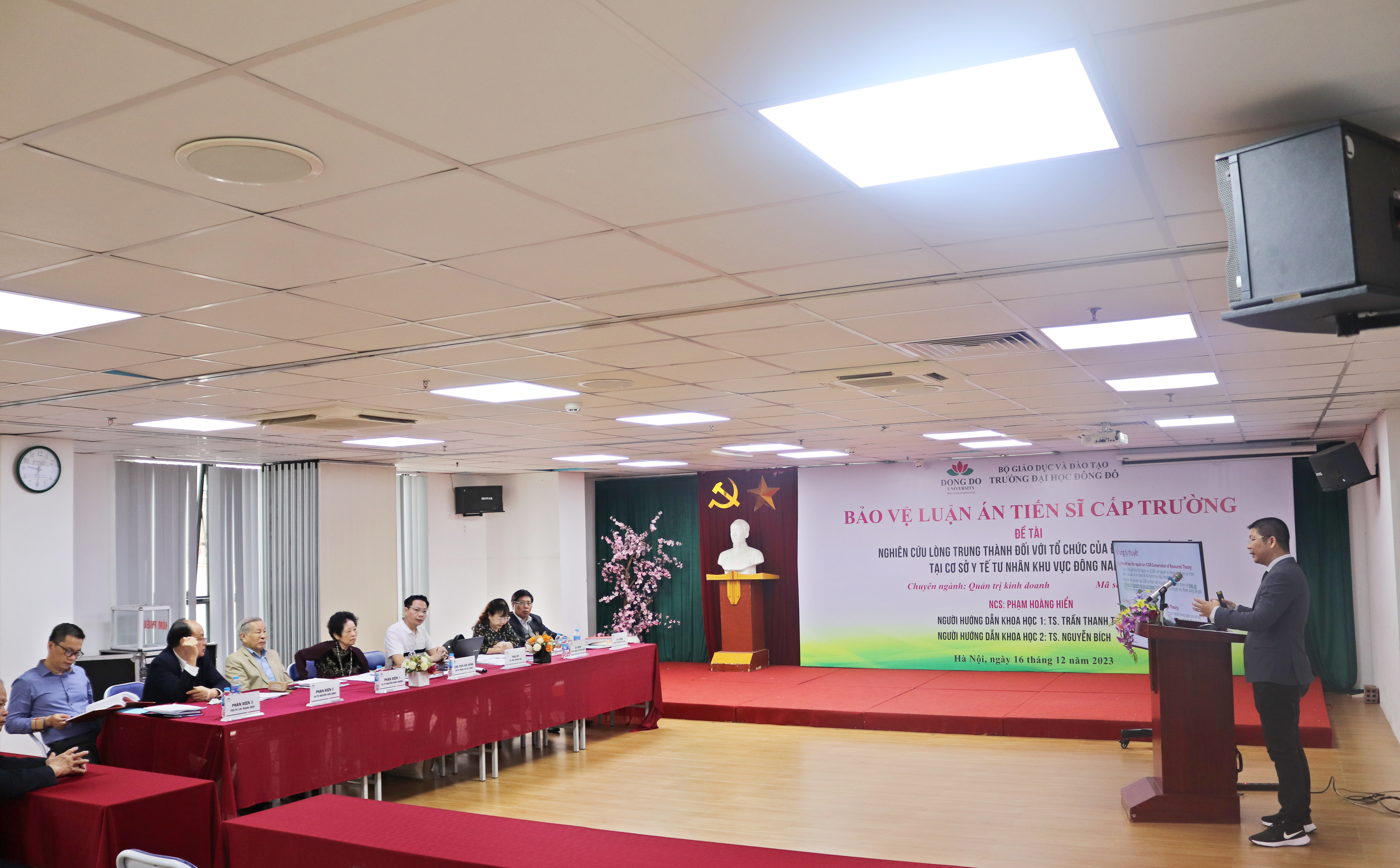 Vào ngày 16/12/2023, Trường Đại học Đông Đô tổ chức họp hội đồng đánh giá luận án Tiến sĩ cấp trường cho Nghiên cứu sinh (NCS) Phạm Hoàng Hiển với đề tài luận án “Nghiên cứu lòng trung thành đối với tổ chức của đội ngũ y bác sĩ tại cơ sở y tế tư nhân khu vực Đông Nam Bộ” thuộc chuyên ngành Quản trị kinh doanh.